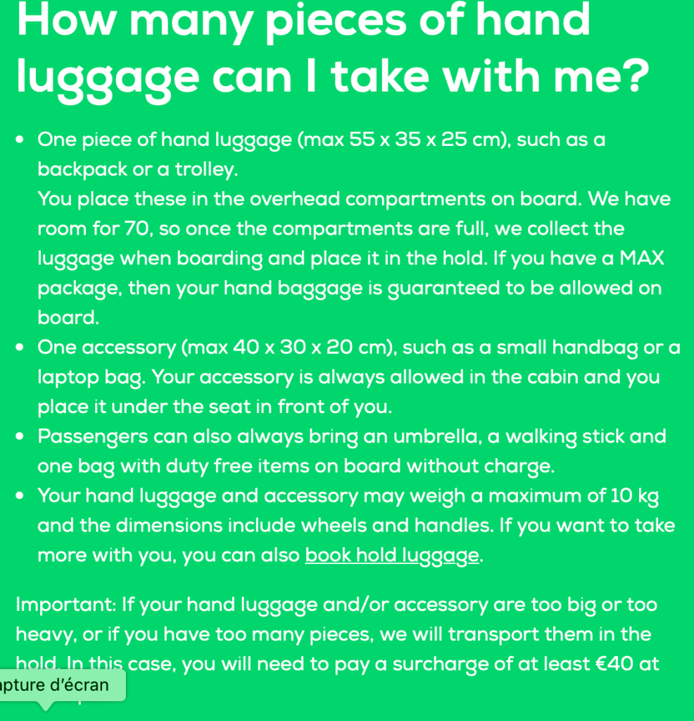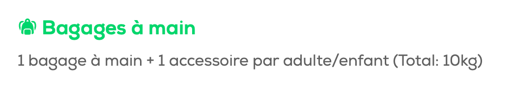 Veuillez noter que garantissons les 70 premiers bagages en cabine. Lorsque les compartiments sont pleins, les bagages restants seront placĂ©s en soute lors de l’embarquement. Si vous avez un tarif MAX, vous ĂȘtes assurĂ© de garder votre bagage Ă main en cabine.