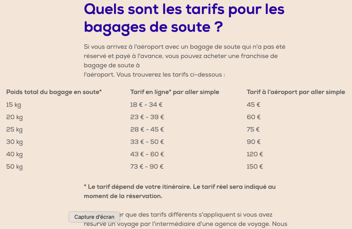 En plus du contrĂŽle des bagages versus tarifs, d’autres frais peuvent surgir comme les 30 euros pour s’enregistrer Ă l’embarquement si on ne l’a pas fait avant en ligne sur le site de la compagnie. Service, qui d’aprĂšs les avis des clients, semblent trop souvent en panne chez certains.