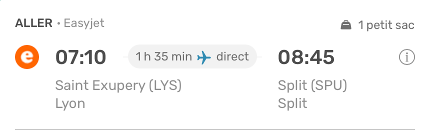 Pour Lyon-Split, la carte des destinations du site de l’aĂ©roport de Lyon Saint-Ex n’indique pas de vols directs (disparus des Ă©crans radars). Or des vols low-cost le font. De plus une rubrique « cheap flight » existe sur le site, mais le moteur de recherche ne propose que les vols de compagnies rĂ©guliĂšres avec escale et no real cheap prices. Nous avons donc Ă©tĂ© cherchĂ© l’information sur le tableau des dĂ©parts ou arrivĂ©es.