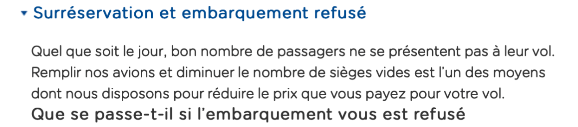 Une lĂ©gislation autorise le surbooking mais aussi les actions Ă entreprendre pour dĂ©dommager pas trop dĂ©taillĂ©es, elles, sur les sites (Tout savoir sur vos droits). La sĂ©lection des candidats qui resteront Ă terre est Ă la discrĂ©tion de la compagnie. Client fidĂšle, place plus chĂšre, service en plus, arrivĂ©e en avance… sont des atouts pour ne pas ĂȘtre extrait de force de votre siĂšge pour redescendre (lĂ©gal mais pas trĂšs bon pour la communication!)