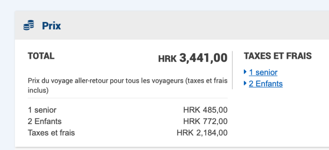 Cette compagnie dĂ©taille le prix des billets et le constat est surprenant quand le prix de dĂ©part est trĂšs bas. Ici, en Kuna (l’euro arrive en 2023).