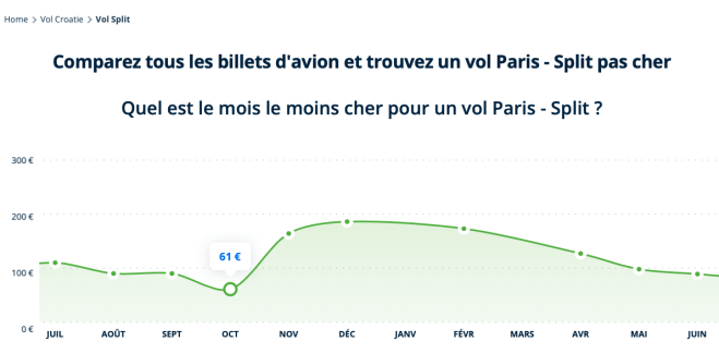 La premiĂšre option est son existence au fond fin du calendrier, genre six mois plus tard, un dimanche Ă 5 heures du mat. Mais on peut trouver la perle avec les bons outils ! Notons que si les sites de conseils suggĂšrent d’acheter trĂšs en avance les billets pour avoir de bons prix, une surveillance sur plusieurs mois des prix sur des vols retour fin aout (chers) Ă partir de Split a fait apparaitre les prix cassĂ©s (20 Ă 40 euros) que dans les derniers jours avant le vol. N’oublions pas que les vols Ă 5 heures du mat pas chers et qui demandent d’arrivĂ©e deux heures avant, Ă©liminent souvent les transports en commun de l’Ă©quation et obligent le recours Ă un taxi plus cher que le billet…