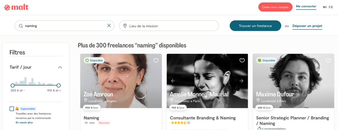 On trouve aussi une myriade de freelances sur des plateformes, Ă l’esprit crĂ©atif et se qualifiant namers. Les prix pratiquĂ©s (ceux pas chers) font douter de la profondeur du travail pourtant nĂ©cessaire, mais pour de petits budgets (- de 3000 euros), la formule est envisageable. Le prĂ©-filtrage juridique, le volet international ou linguistique sont toutefois souvent absents de la prestation.