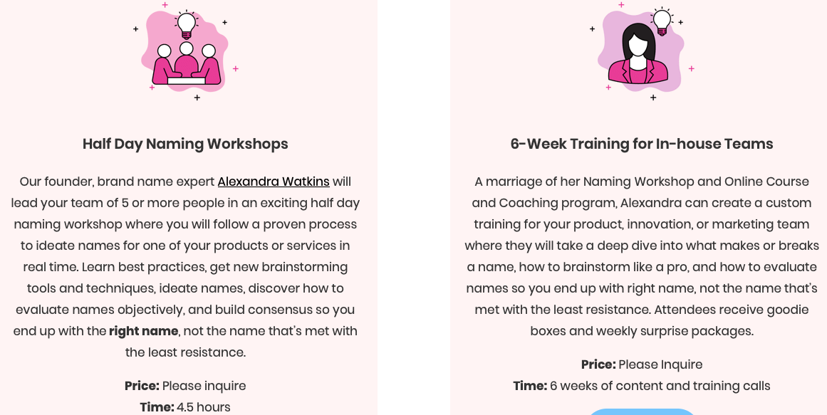 Ce type de rĂ©fĂ©rencement permet, contrairement Ă Google Ads, d’ĂȘtre uniquement ciblĂ©s et contactĂ©s par des professionnels avec budget Ă la recherche d’une agence. Pas de touristes comme le startupper Ă l’idĂ©e gĂ©niale qui veut un nom comme Apple ou Nike censĂ© faire exploser son CA dans la semaine ou le coiffeur du fond de la Creuse qui cherche un nom pour son enseigne, le tout Ă moins de 150 euros. Les agences et namers vraiment professionnels proposent en gĂ©nĂ©ral des tarifs entre 3.000 et 10.000 euros. Les douloureuses expĂ©riences, le dĂ©tail des services et la comprĂ©hension des difficultĂ©s et complexitĂ©s du naming vous expliqueront cette diffĂ©rence.