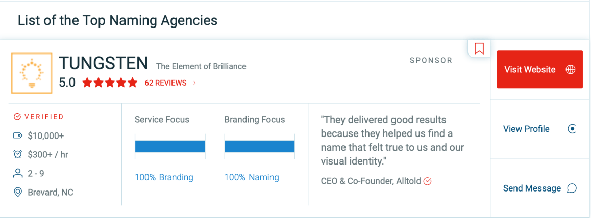 Pour ĂȘtre contactĂ©es, les agences Ă vocation globale se rĂ©fĂ©rencent Ă©galement sur des plateformes de sourcing qui prĂ©sentent leurs caractĂ©ristiques principales pour un comparatif dĂ©cisionnel. Un exemple avec le mot clĂ© « naming » avec Tungsten, ses reviews, Ă©toiles, pourcentage d’activitĂ© naming… PlacĂ©s en tĂȘte de liste, bien sĂ»r, les « sponsors » comme ici :