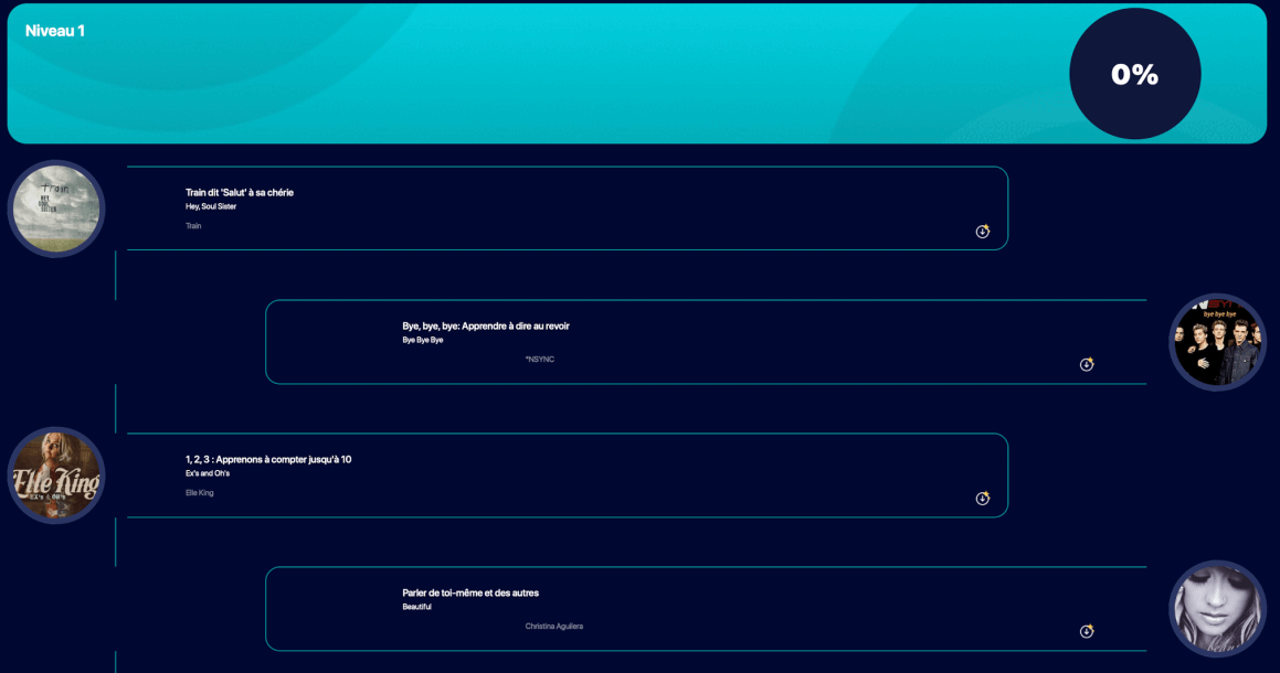 Pour apprendre, l’application propose un circuit balisĂ© et linĂ©aire de progression avec comme point de dĂ©part une chanson sĂ©lectionnĂ© par elle. TrĂšs simplement, des Ă©tapes sont proposĂ©es avec un travail d’Ă©coute et de rĂ©vision.