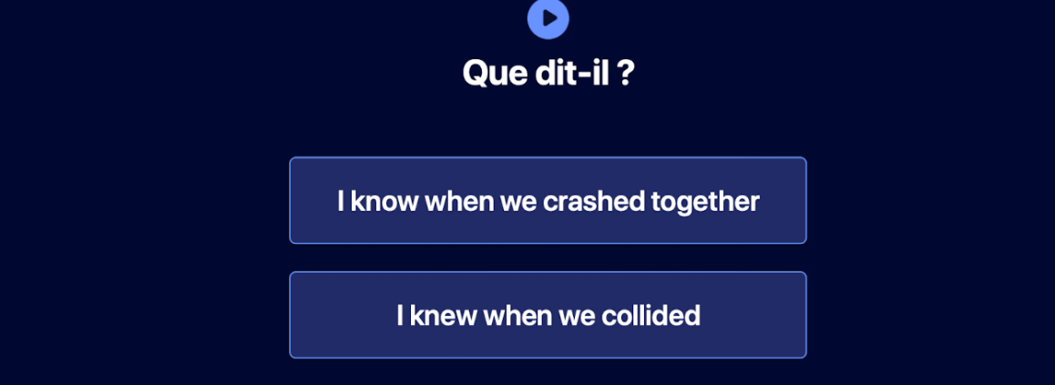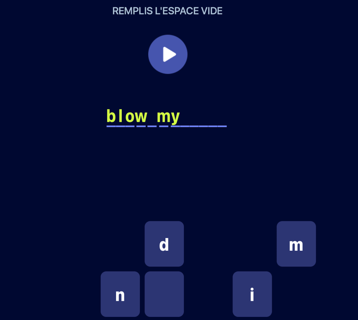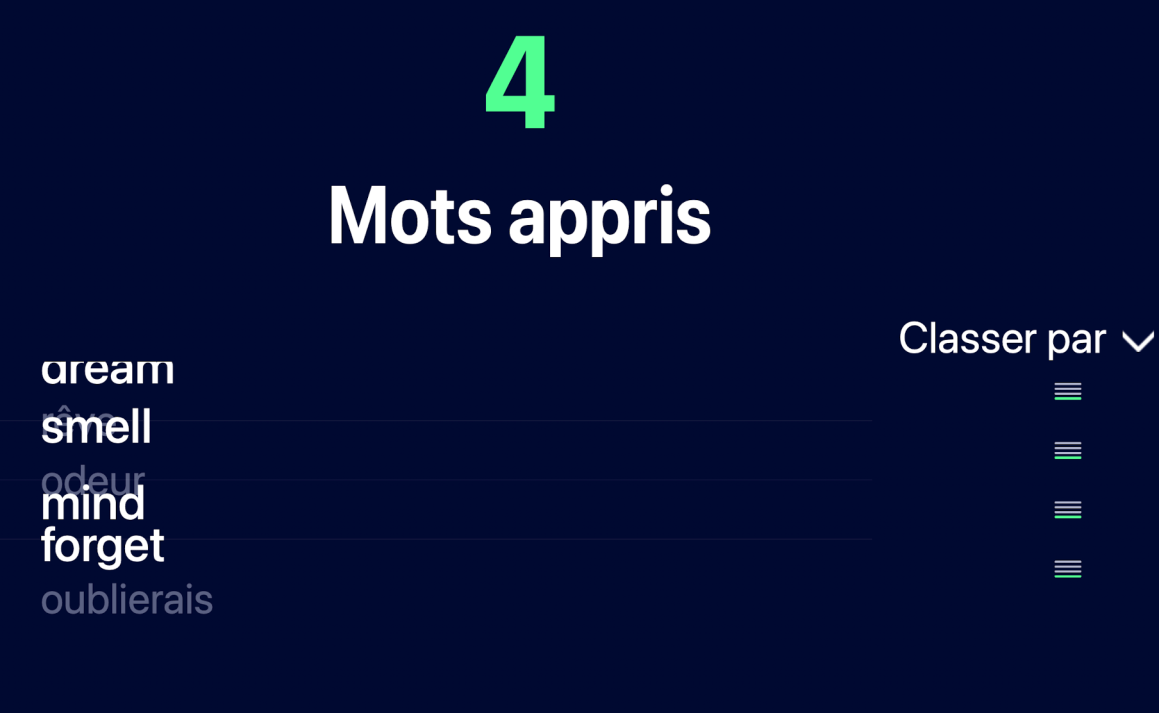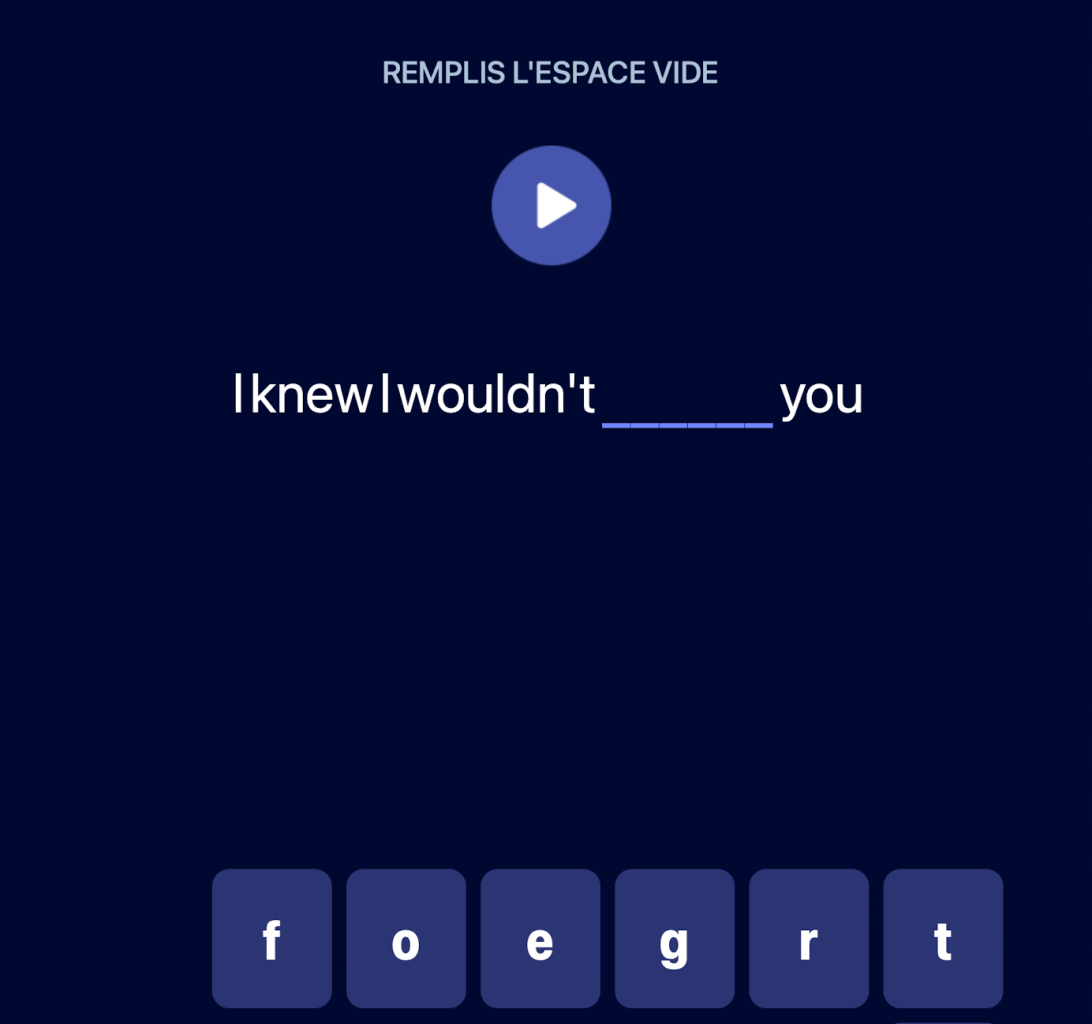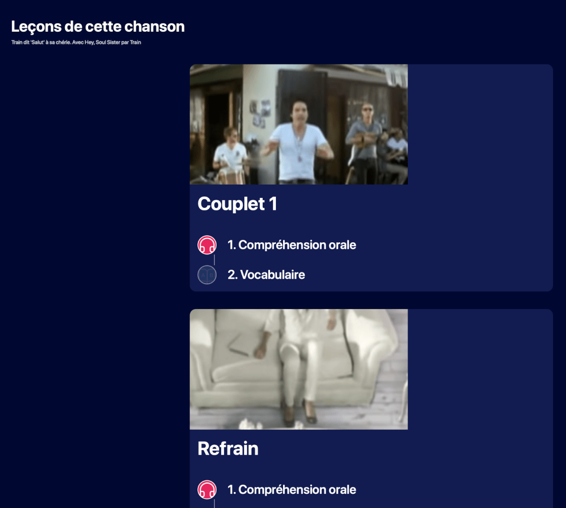 TrĂšs simples, ils suivent le flux de la chanson en la dĂ©coupant en petits extraits et en proposant une batterie d’exercices pour travailler le vocabulaire. L’apprentissage est multidirectionnel (Ă©coute, Ă©crit, comprĂ©hension…) et utilise la rĂ©pĂ©tition espacĂ©e pour un travail de mĂ©morisation. Beaucoup de petits extraits de musique permettent le travail de l’oreille. Les rĂ©ponses aux quizz sont immĂ©diates et affichent un bandeau vert en cas de rĂ©ussite.