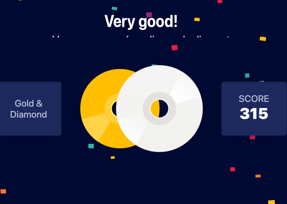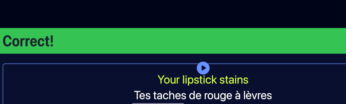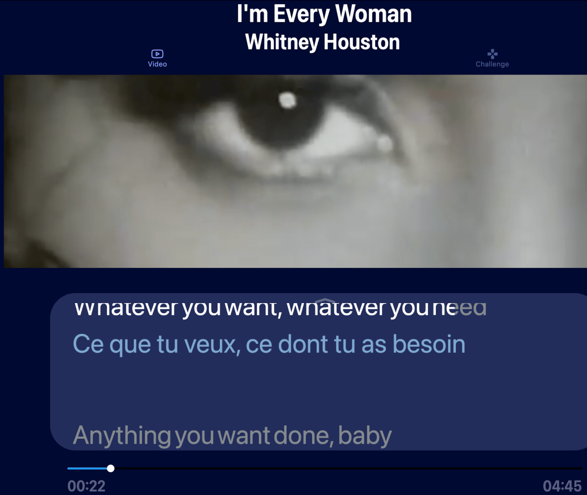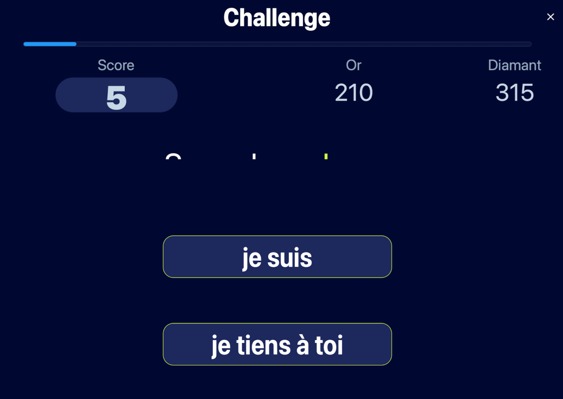 On peut ensuite cliquer sur challenge pour un jeu. Il faut alors Ă©couter attentivement (sans texte) pour repĂ©rer et cliquer sur la bonne traduction. On gagne Ă©ventuellement des disques d’or ou de diamant selon votre score. Plaisant car facile et avec l’Ă©coute complĂšte de la chanson!