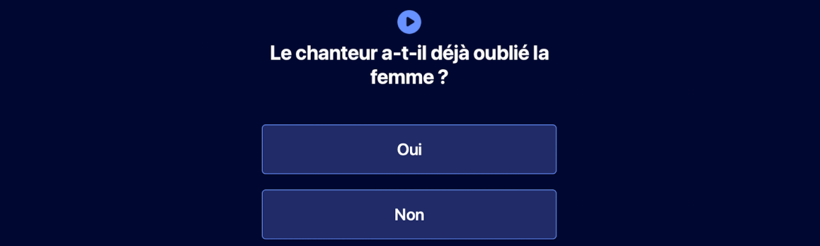 Un catalogue de chansons est proposĂ© pour l’Ă©coute totale avec transcription et traduction (option) dynamiques. L’appellation « jouer » ne reflĂšte donc pas totalement cette fonction que nous qualifierons de rĂ©vision. Ici, on choisit dans le catalogue!