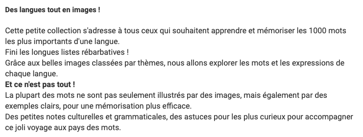 Un livre, une langue et des images! Le concept est de prĂ©senter un glossaire de mots accompagnĂ© de visuels pour une meilleure mĂ©morisation en utilisant l’association mot-image.