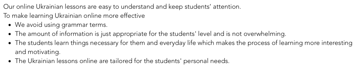 Des leçons simples, mais approfondies et une progression facile, mais sĂ©rieuse sont les deux atouts principaux du livret. Les leçons sont composĂ©es de « blocs » thĂ©oriques de dĂ©couverte accompagnĂ©s de ceux de « la pratique » avec de nombreux exercices simples, mais efficaces. Notons qu’Ă part les consignes de l’exercice, tout est ici Ă©crit en ukrainien pour une rĂ©elle immersion… AprĂšs chaque groupe de leçons, un lexique permet d’acquĂ©rir le vocabulaire utilisĂ© par petites Ă©tapes.