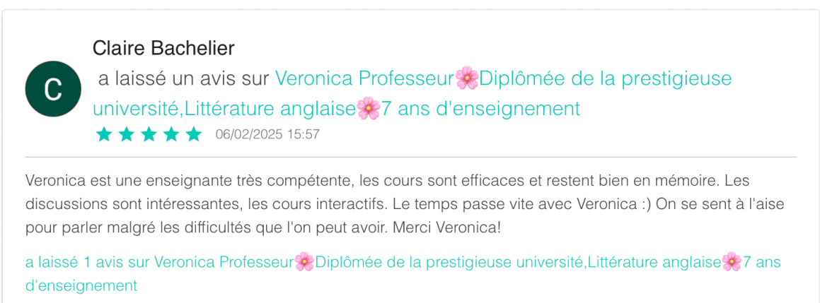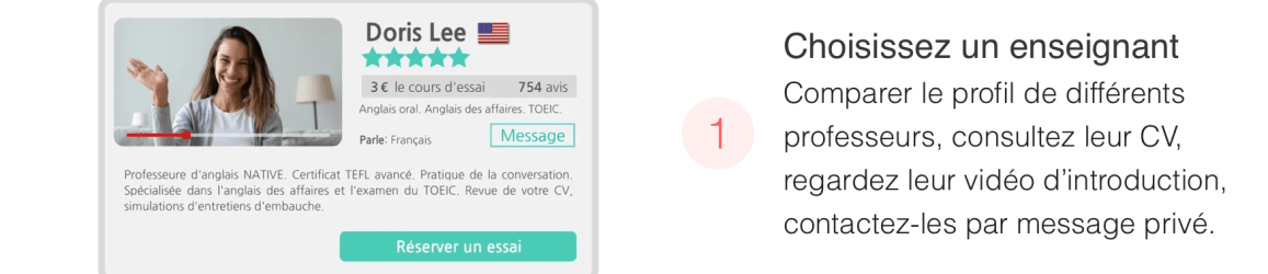 Question budget, le comparatif avec d’autres plateformes doit se faire en tenant compte de la durĂ©e des cours (trĂšs variable), ici 50 minutes. Les vidĂ©os sont devenues incontournables, car elles permettent d’affiner la sĂ©lection (et, aussi, de choisir l’accent ou la prononciation qui vous facilite la tĂąche…)