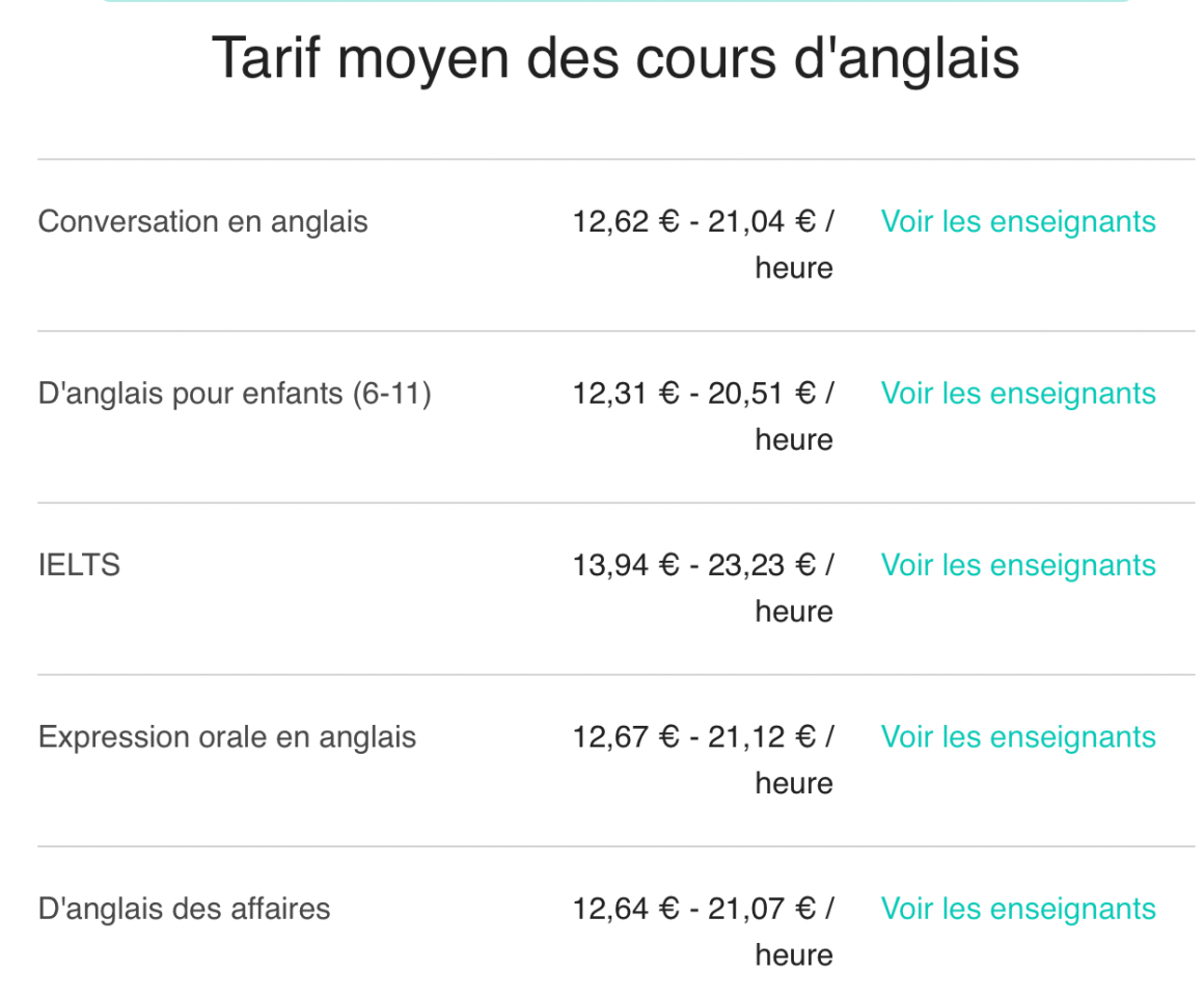 Les tarifs proposĂ©s en moyenne sont un trĂšs bon indicateur du marchĂ©! En dessous des minimas, vous en avez pour votre argent et multiplier les cours en raison d’une mauvaise efficience. Au delĂ des maximas, vous vous faites plumer et arriverez en bout au tarif trĂšs français de la formation professionnelle.